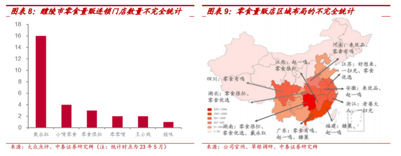 以湖南省辖县级市醴陵市为例,醴陵市2022年户籍人口仅100多万人,而根据大众点评搜索数据,截至23年5月,醴陵市总计有16家戴永红、4家小嘴零食、3家零食很忙。县域市场零食量贩竞争正在进入白热化。