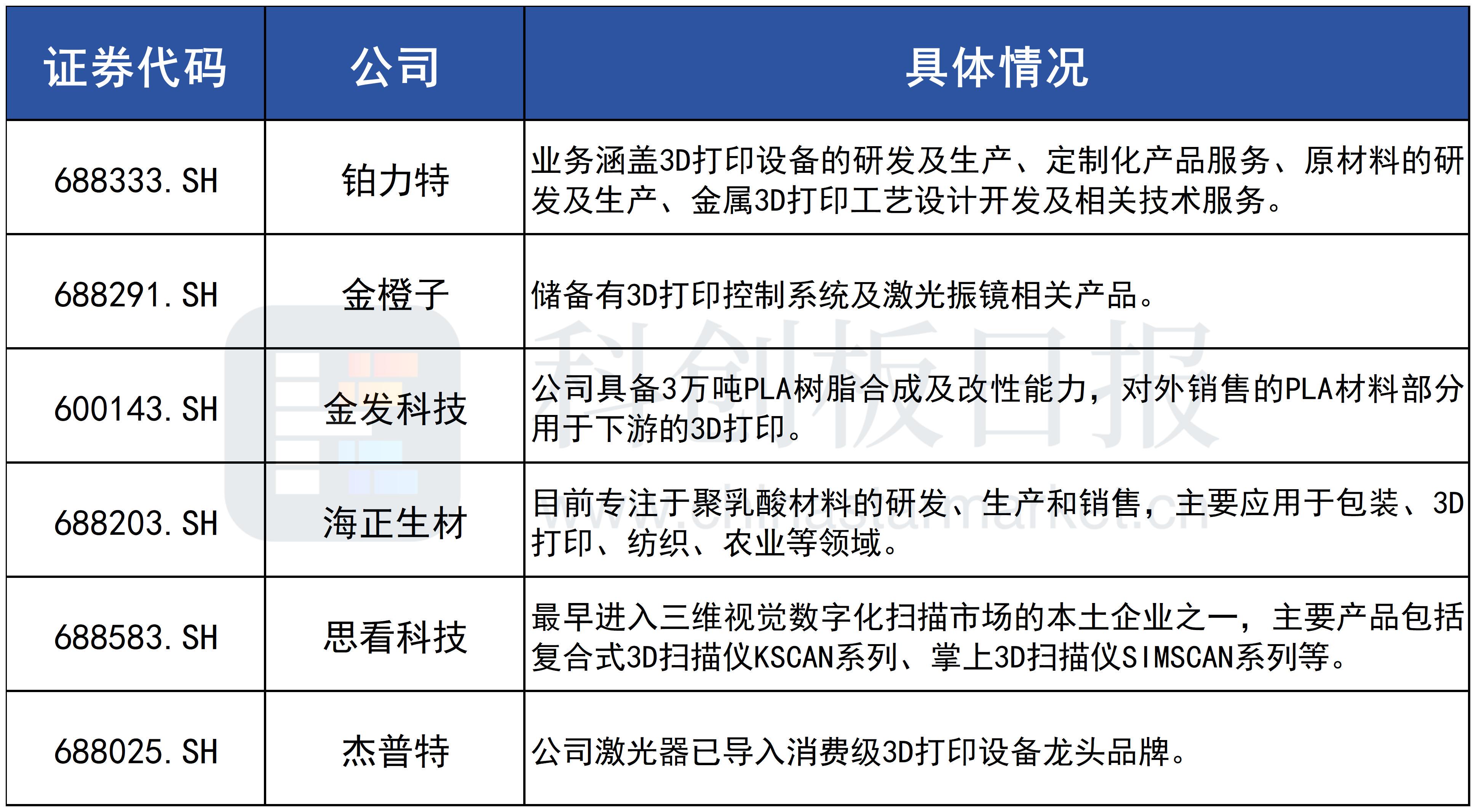 据《科创板日报》不完全统计,A股上市公司中已布局3D打印设备及相关耗材的企业有: