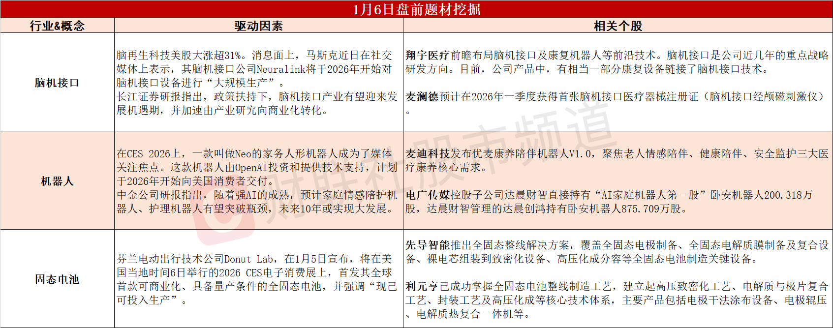 【盘前题材挖掘】①脑再生科技美股大涨超31%,脑机接口商业化落地有望提速。②OpenAI家务机器人售价2万美元,家庭机器人有望实现跨越式发展。③全球首款可量产全固态电池问世,固态电池产业投资机遇凸显。