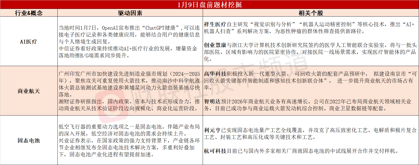【盘前题材挖掘】①OpenAI发布ChatGPT健康,AI医疗市场有望加速爆发。②广州推动两大火箭总装基地尽快落地,可回收火箭迈入黄金发展期。③低空经济、机器人的需求持续催化,固态电池产业化进程提前加速。