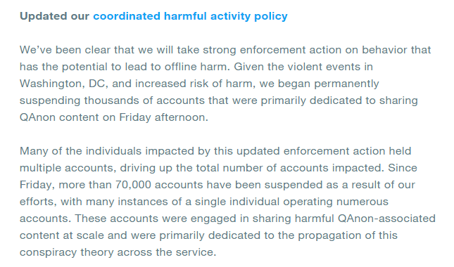 “鉴于华盛顿特区的暴力事件以及伤害风险的增加,我们从周五下午开始永久性地封停数千个主要用于分享QAnon内容的帐户,” 该公司周一在一篇博客文章中表示。“这些账户大规模分享与QAnon相关的有害内容,主要致力于在整个服务中传播这种阴谋论。”