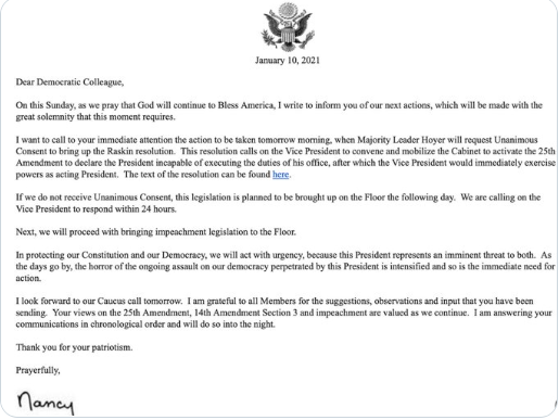 佩洛西在这封邮件中透露,民主党议员和众议院将在周一投票通过一项决议,敦促副总统彭斯援引第25修正案,解除特朗普的总统职务并弹劾他。如果彭斯没有在24小时内回应,民主党将推动周二召开众议院全体投票,弹劾总统。