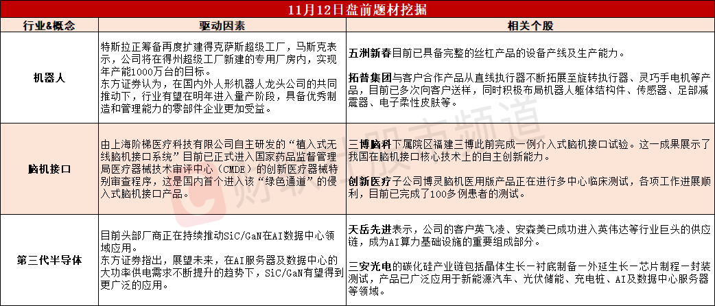 【盘前题材挖掘】①特斯拉筹备扩建机器人超级工厂,相关零部件环节有望持续受益。②国内首次!脑机接口产品进入审批“绿色通道”,行业或进入爆发前夜。③第三代半导体突破供电瓶颈,有望在AI数据中心领域广泛应用。