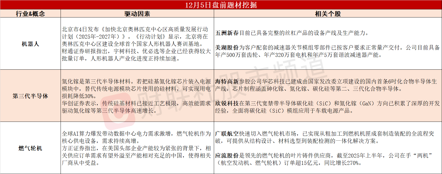 【盘前题材挖掘】①北京将建全球首个国家人形机器人赛训基地,人形机器人产业化持续加速。②一年可为超大型AI算力中心省3亿度电,第三代半导体有望迎来需求爆发。③全球AI算力爆发带动燃气轮机需求激增,国内企业有望受益于外溢需求。
