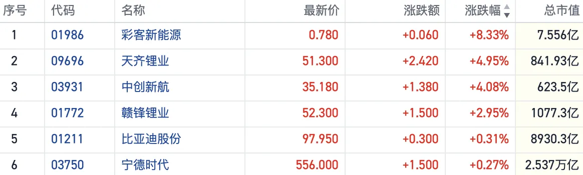 截至发稿,天齐锂业(09696.HK)涨近5%,中创新航(03931.HK)涨超4%,赣锋锂业(01772.HK)、宁德时代(03750.HK)等行业龙头也明显走强。