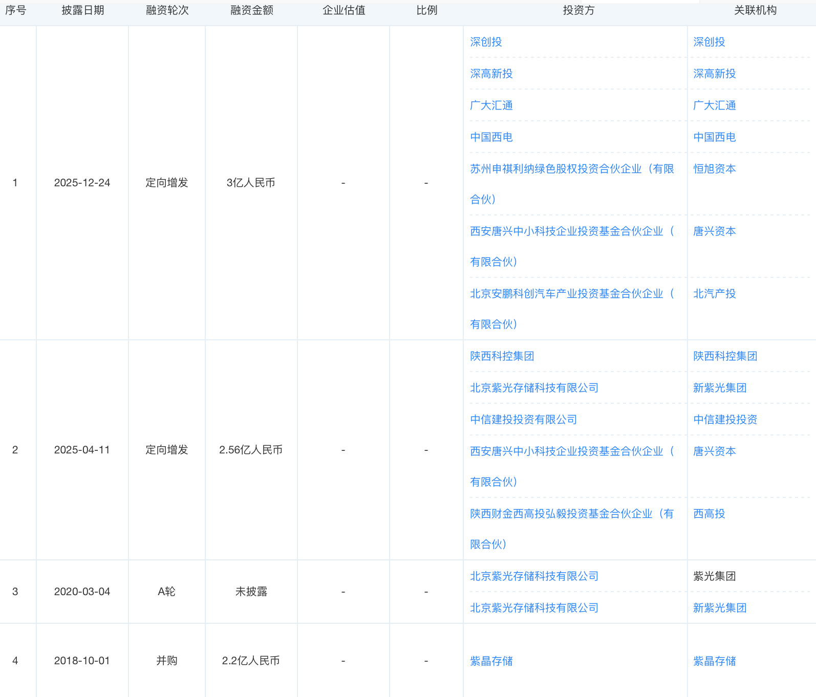 融资历程方面,紫光国芯目前共历经4轮融资,最早于2018年10月被紫光存储集团以2.2亿元收购。此后的2025年4月和12月分别完成2轮定向增发,定增对象包括西高投、陕西科控集团、深高新投、深创投等一众国有资本,中信建投投资这一金融机构,以及北汽产投、中国西电两大产业资本。