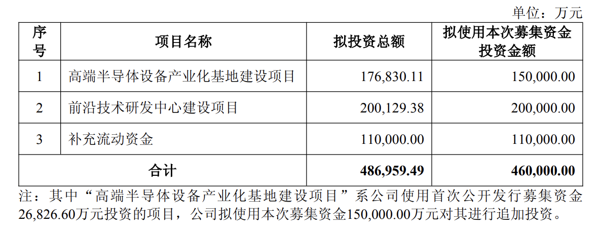 公告显示,拓荆科技拟向特定对象发行股票募集资金总额不超过人民币46亿元,将用于高端半导体设备产业化基地建设项目、前沿技术研发中心建设项目建设,其中将投入11亿元用于补充流动资金。