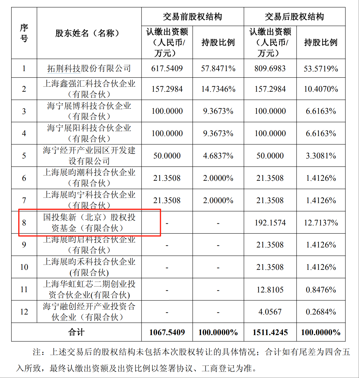 国投集新(北京)股权投资基金(有限合伙)(下称“国投集新”)拟以不超过人民币4.5亿元,认缴拓荆键科新增注册资本人民币192.1574万元。