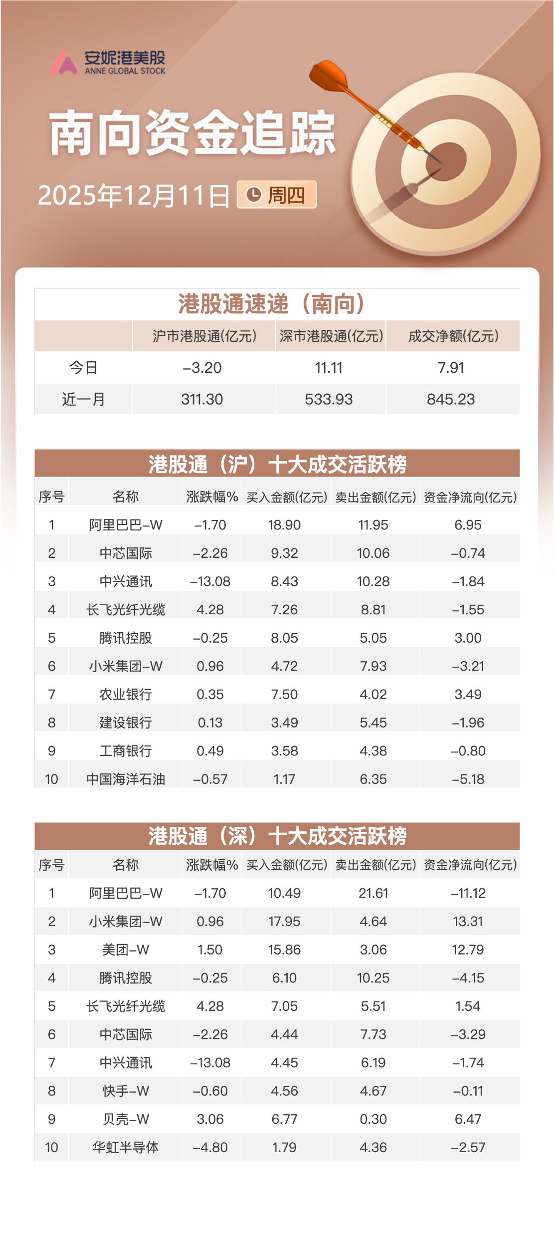 港股今日高开低走震荡整理,南向资金全天仅净买入约7.91亿港元。其中,沪港股通净流出约3.20亿港元,深港股通净流入约11.11亿港元。