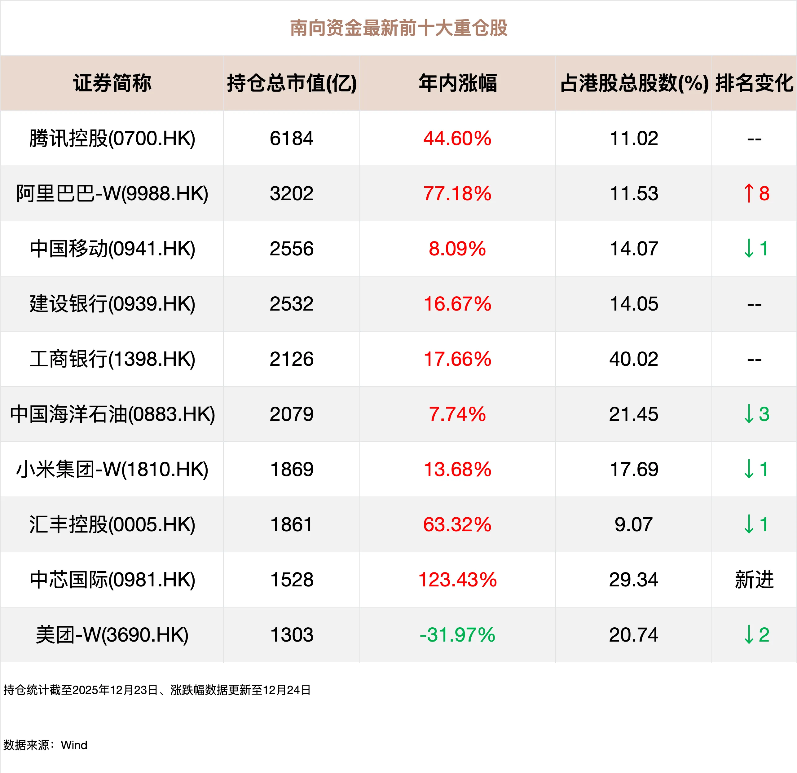 此外,尽管今年港股在宽幅波动中迎来多轮持续上涨行情,但南向资金前十大重仓股仍相对稳定。