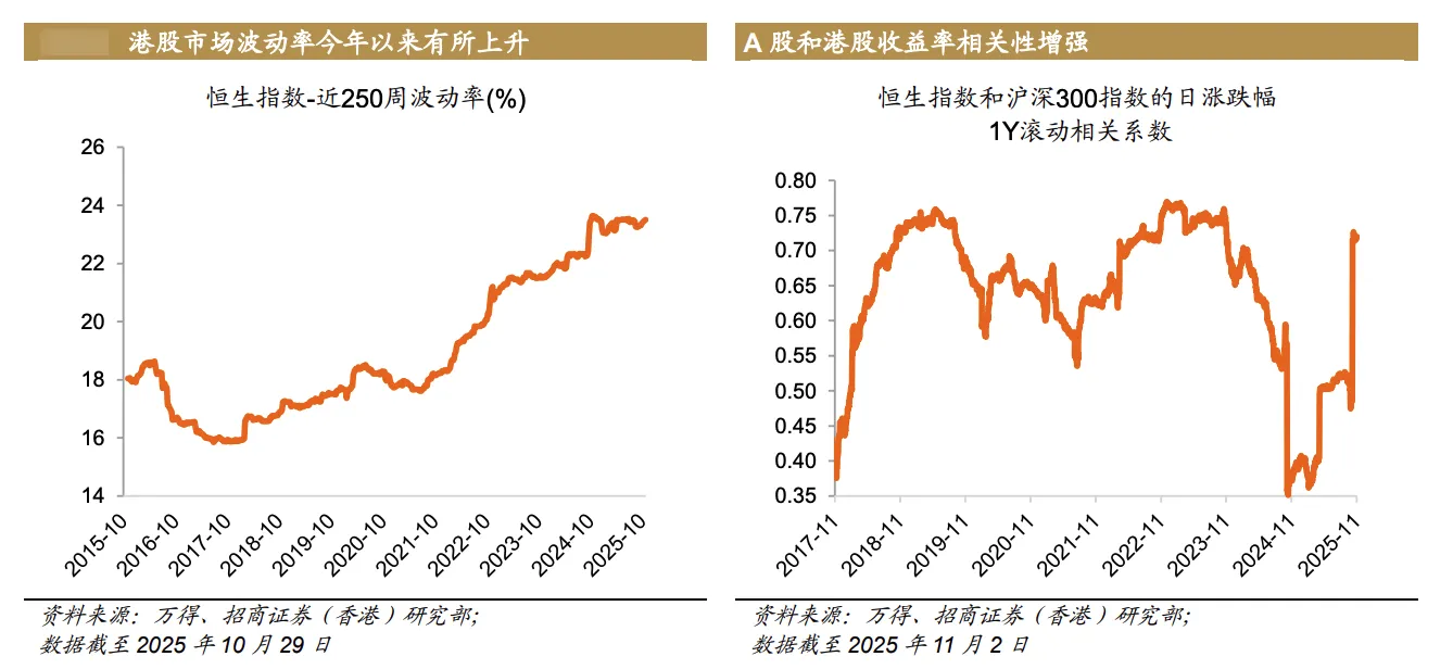 据招商证券(香港)研究称,随着南向资金持续净流入,港股的波动率有所上升,且恒生指数与沪深300的相关性也有所增强。