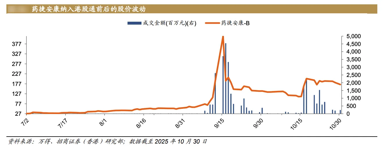 上述变化无疑增加了市场的波动、风险和投资难度,也让不少港股投资者成为泡沫的“接盘侠”。港股通年内涨幅第一的牛股药捷安康(02617.HK)在“被动入通”前后的“过山车”行情,也已成为这一现象的经典案例。