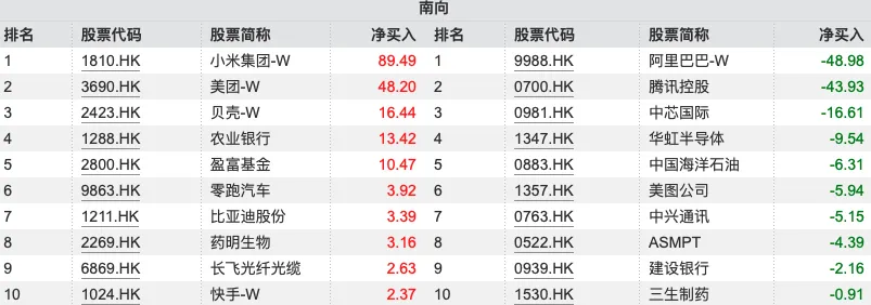 大幅净买入:小米集团-W(01810.HK)89.49亿港元;美团-W(03690.HK)48.20亿港元;贝壳-W(02423.HK)16.44亿港元;农业银行(01288.HK)13.42亿港元。