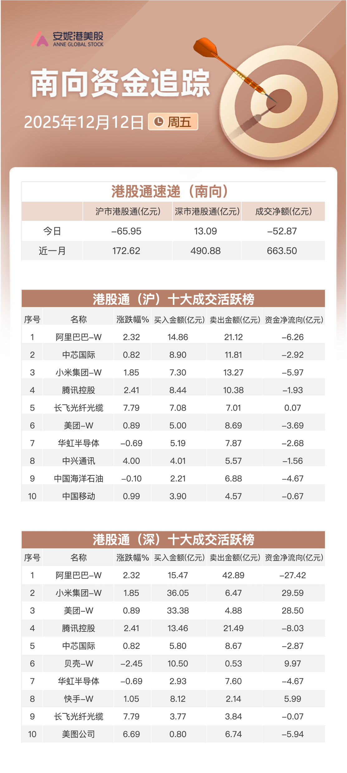 今日,南向资金净卖出约52.87亿港元,其中沪港股通净流出65.95亿港元,深港股通净流入约13.09亿港元。
