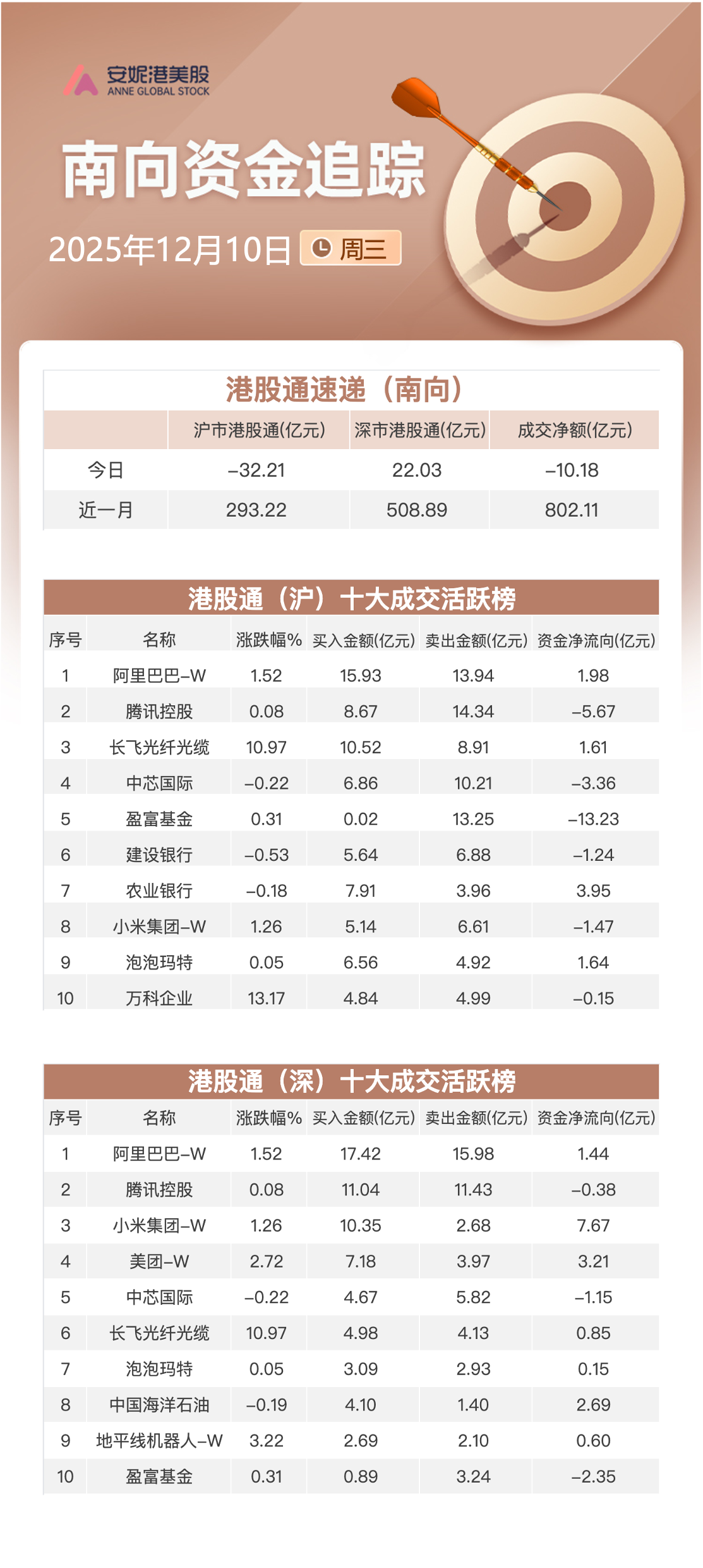 大幅净买入:小米集团-W(01810.HK)6.20亿港元;农业银行(01288.HK)3.95亿港元;阿里巴巴-W(09988.HK)3.43亿港元;长飞光纤光缆(06869.HK)2.46亿港元。
