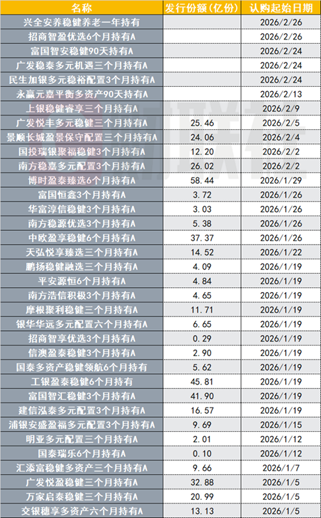 今日,招商智盈优选6个月持有A、兴全安养稳健养老一年持有开始发行。2月24日,民生加银多元稳裕配置3个月持有A、富国智安稳健90天持有A、广发稳泰多元机遇三个月持有A等三只产品发行。