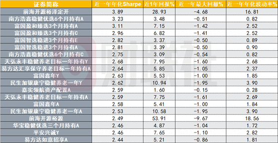 进一步来看,偏债混合FOF的风险收益比非常优秀。以夏普比率衡量,近一年偏债混合FOF的中枢超过1.7(股票基金一般不足1),表现极优者甚至超过3。在控制风险的前提下,也有部分产品兼顾高回报,近一年收益超过20%。