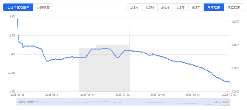 资金涌入如此火爆,该产品收益率如何?据法询理财网披露数据,截至12月12日,该产品7日年化收益率为3.58%、近1月年化收益率为3.63%,近3月年化收益率为3.75%,近6月年化收益率为3.85%,成立以来年化收益率为3.88%。