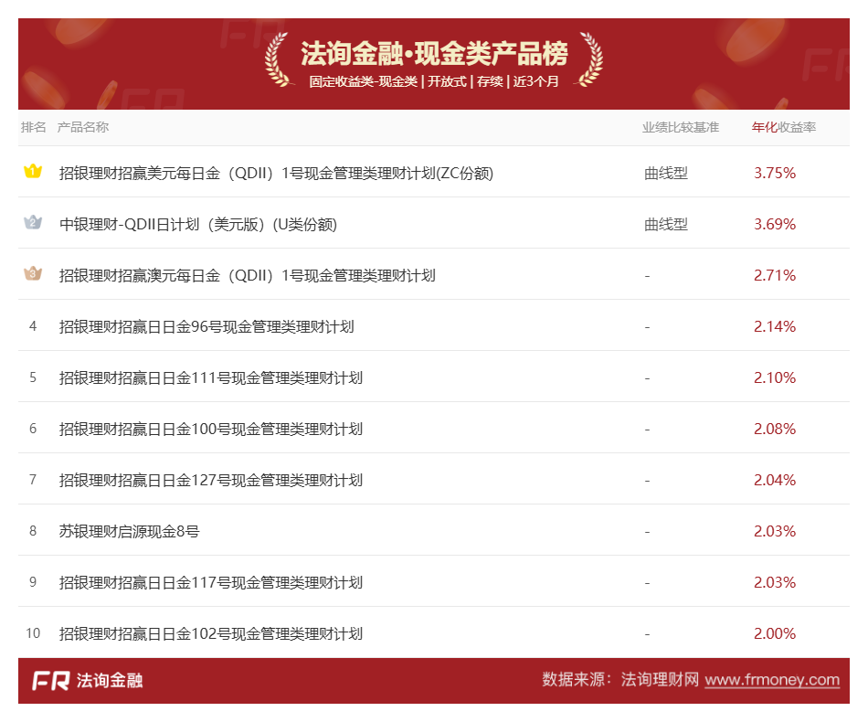 据法询理财网排名榜单,该产品位列现金类榜单首位,近3个月年化收益率为3.75%。