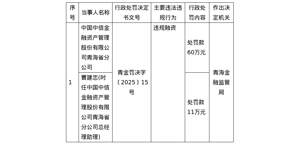 12月12日讯 国家金融监督管理总局青海监管局发布了一张罚单,剑指中国中信金融资产管理股份有限公司青海省分公司及其相关责任人。