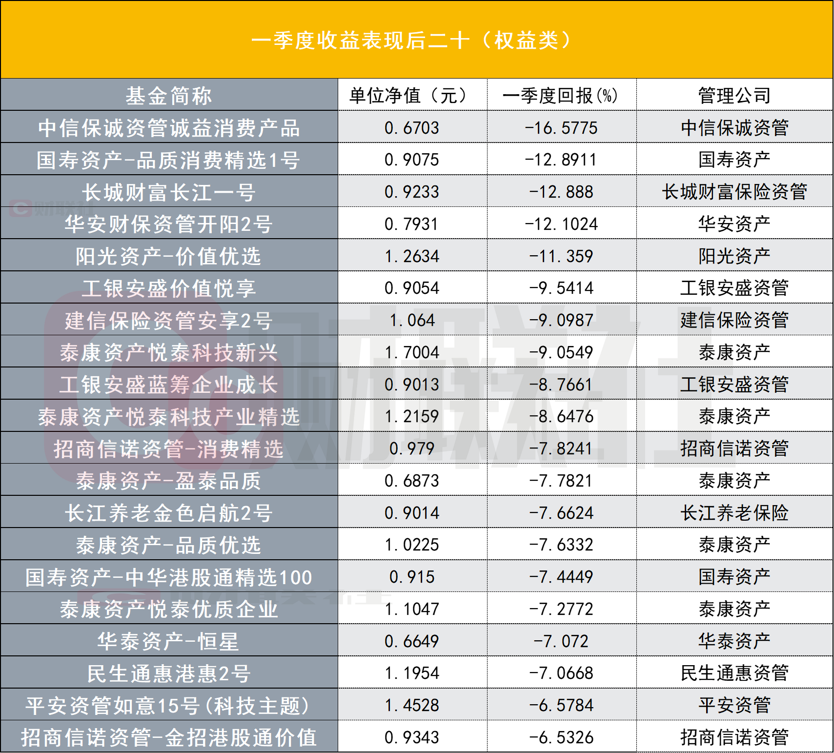 一季度全市场收益垫底的5只产品均来自权益类,其中,中信保诚资管诚益消费产品一季度区间收益率为-17.73%,位列全市场末位,与消费赛道相关的国寿资产品质消费精选1号,也以-12.89%的季度收益表现紧随其后,与头部产品的业绩分化明显。