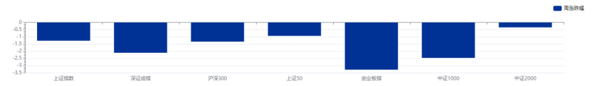 上周主要权益指数下跌。其中,上证指数下跌1.27%,深证成指下跌2.1%,沪深300下跌1.33%,上证50下跌0.93%,创业板指下跌3.28%。中证1000和中证2000分别下跌2.46%、0.34%。