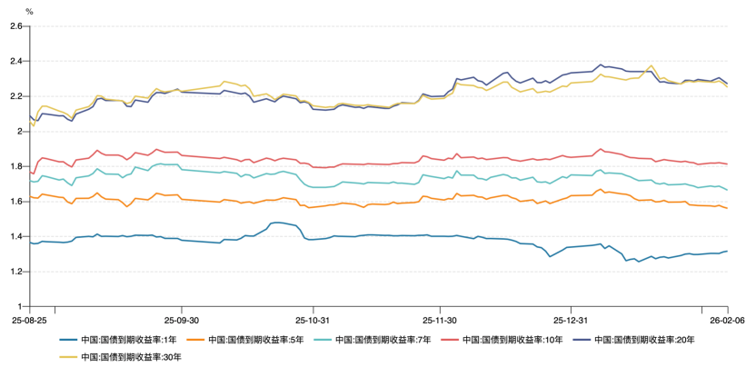 上周,主要利率债收益率多数震荡下行。截至2月6日收盘,1Y、5Y、7Y国债分别报收1.3158%、1.5601%、1.6635%,分别较前一周收盘变动2BP、-1.6BP、-1.4BP;10Y、20Y、30Y国债分别报收1.8121%、2.27%、2.25%,分别均较前一周收盘变动0.2BP、-2.5BP、-3.45BP。