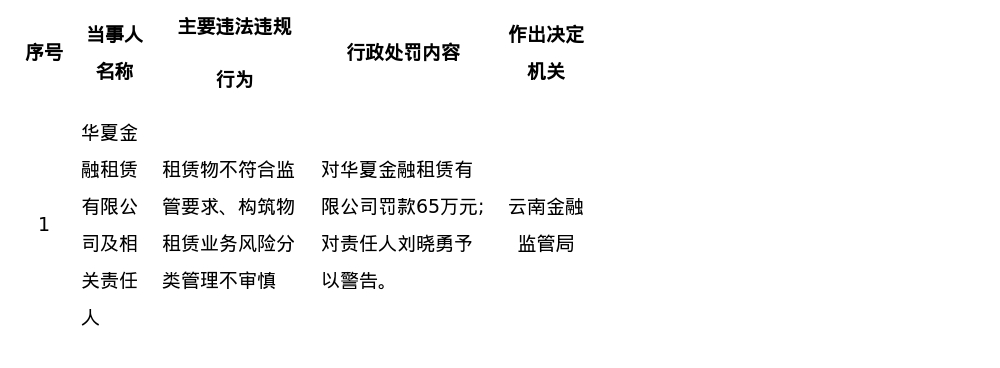针对上述违法违规行为,云南金融监管局对华夏金租罚款65万元;对责任人刘晓勇予以警告。