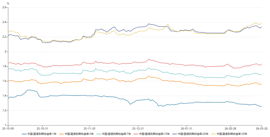 上周,主要利率债收益率多数震荡上行。截至3月20日收盘,1Y、5Y、7Y国债分别报收1.26%、1.56%、1.69%,分别较前一周收盘变动-2BP、0.2BP、0.04BP;10Y、20Y、30Y国债分别报收1.83%、2.335%、2.39%,分别较前一周收盘变动1.7BP、0.25BP、3BP。