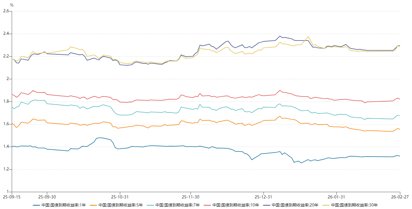上周,主要利率债收益率多数震荡上行。截至2月27日收盘,1Y、5Y、7Y国债分别报收1.3156%、1.55%、1.674%,分别较春节前最后一个交易日收盘变动0.3BP、1BP、2BP;10Y、20Y、30Y国债分别报收1.812%、2.295%、2.288%,分别均较春节前最后一个交易日收盘变动2BP、4BP、4.6BP。