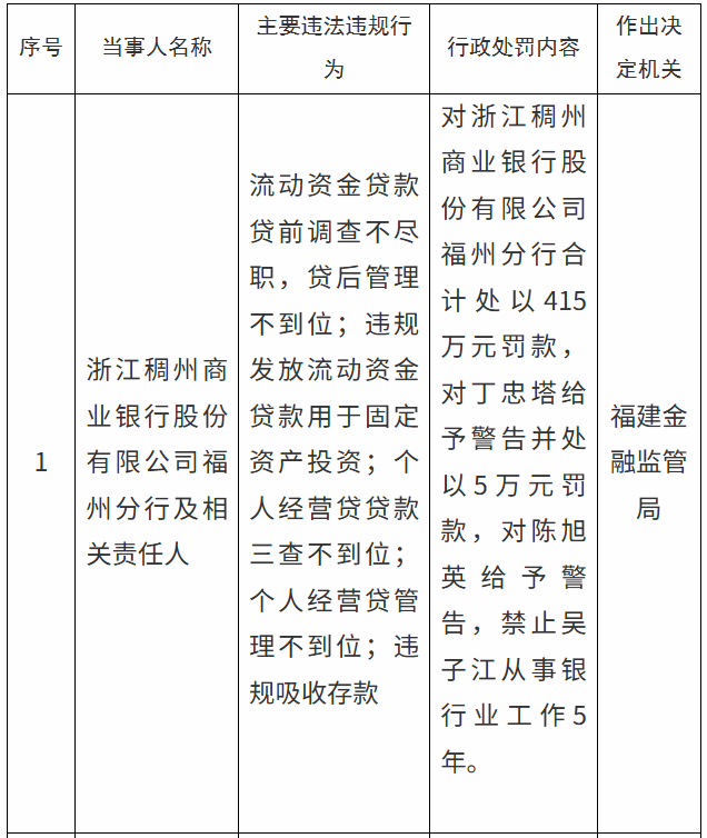 针对上述违法违规行为,福建金融监管局对稠州银行福州分行罚款415万元;对丁忠塔给予警告并处以5万元罚款;对陈旭英给予警告;对吴子江禁止从事银行业工作5年。
