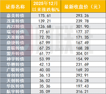 市场连续大涨后,公募转债中位价格已达133.72元,全市场37只转债价格超过200元。从12月以来涨幅居前的转债来看,多为高价转债。