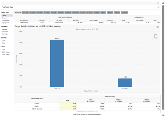 此外,根据CME FedWatch数据,市场目前预计美联储12月维持利率不变的概率为15.3%,而降息25个基点的概率升至84.7%,相比一周前的约30%明显提升。