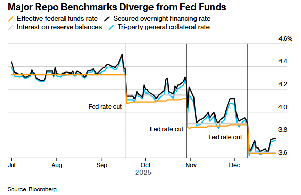 根据纽约联储周二公布的数据,作为隔夜融资市场重要基准的有担保隔夜融资利率(SOFR)在12月29日定在3.77%,这比美联储准备金余额提供的利率高出12个基点。