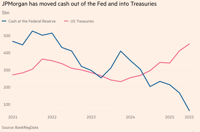 根据行业数据追踪机构BankRegData汇编的数据显示,摩根大通自2023年以来已从美联储账户中撤出近3500亿美元现金,并将其中大部分投入了美国国债,以抵御可能侵蚀其利润的降息风险。