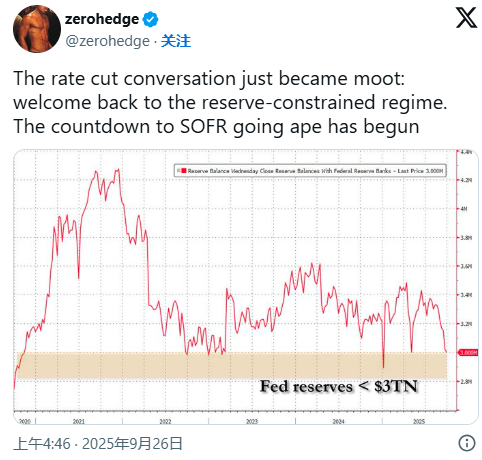 美联储的银行准备金在今秋跌破了3万亿美元大关,大多数美联储官员认为这是准备金从‘充裕’到‘稀缺’的分界线——对于不熟悉相关概念的人来说,当准备金变得‘稀缺’时,银行融资就会紧张,回购市场就会失控,市场通常会崩盘,因此除了空头之外,这种情况被大多数人都视为是负面的。