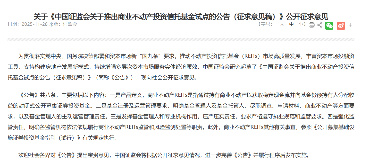 目前《公告》处于公开征求意见阶段,市场各方将围绕条款展开讨论并提出优化建议,推动制度更贴合实际。随着意见征集推进与正式文件出台,商业不动产REITs有望逐步落地,为资本市场与房地产行业注入新活力。