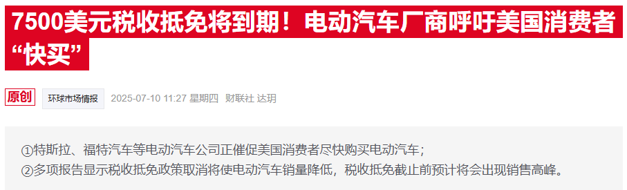 上月,美国国会两院通过了美国总统特朗普力推的所谓“大而美”法案。法案中规定,美国政府从今年9月30日起将不再为电动汽车提供税收抵免。