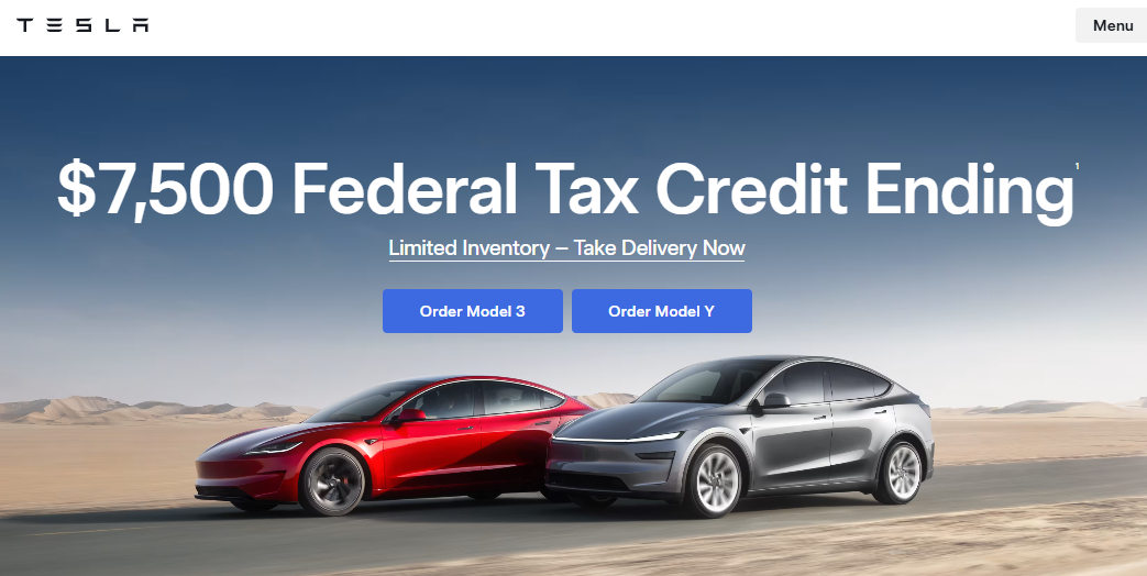 分析师称,经销商也在利用即将到来的9月30日截止日期,制造紧迫感来推动销量。截至发稿,特斯拉美国官网首页顶端就用粗体字写着:“7500美元联邦税收抵免即将结束”。