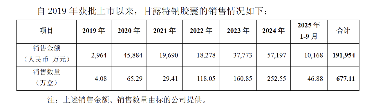 另值得关注的是,回复函对于九期一的销售数据进行了首次确切的公开披露。具体而言,从2019年获批至2025年9月,甘露特钠胶囊累计销售额达19.20亿元,累计销量 677.11万盒,其中,2024年创下销售峰值,销量超252万盒,销售额达5.72亿元。今年前9个月,共计卖出46.88万盒,销售金额为1.02亿元。