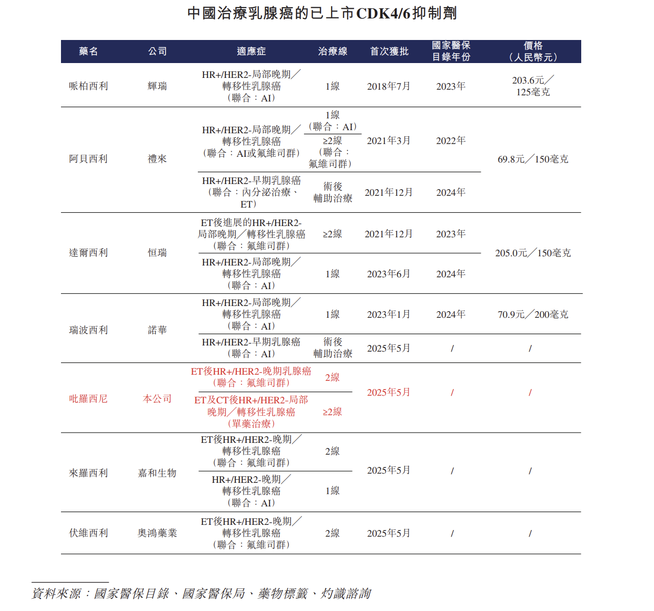当前其面临的国内市场竞争极为激烈,截至目前,国内已有多款创新CDK4/6抑制剂获批用于乳腺癌治疗,形成了“原研+国产”同台竞技的格局,包括辉瑞的哌柏西利、礼来的阿贝西利、诺华的瑞波西利、恒瑞医药的达尔西利、嘉和生物的来罗西利等。其中,前4款产品均已被纳入国家医保目录。
