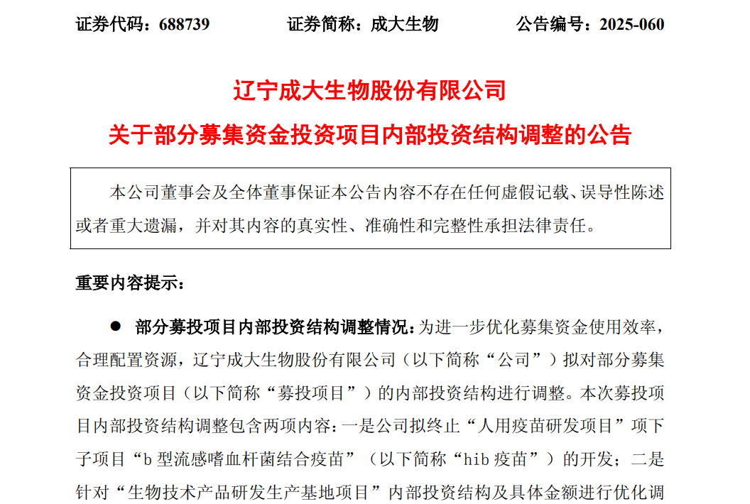对于终止“Hib疫苗”项目的原因,成大生物方面解释称,是基于行业趋势、市场竞争及战略资源配置的综合考量。