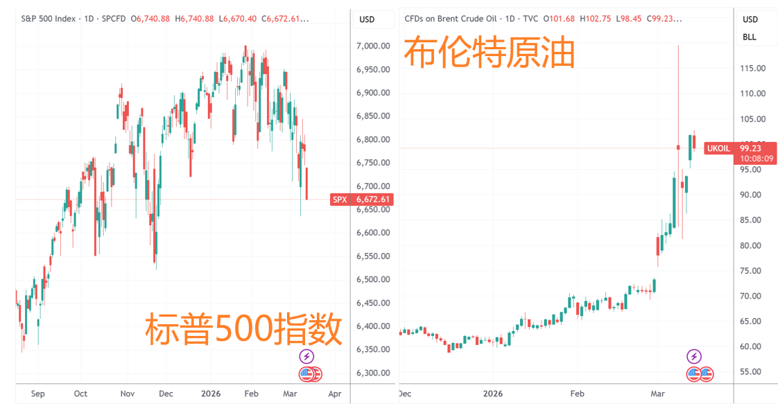 截至发稿, 纳斯达克100指数期货(2603合约)涨0.44%,标普500指数期货涨0.46%,道指期货涨0.45%。布伦特原油仍在每桶100美元附近震荡。从走势来看,目前股票市场仍在遵循“油价涨、股票跌”的逻辑,反之亦然。