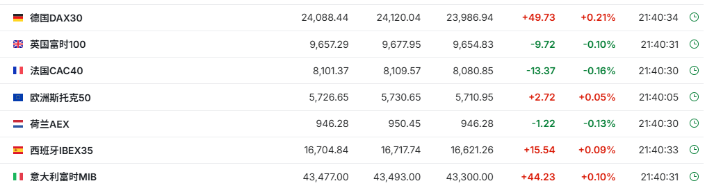 正在交易的欧洲股市涨跌不一,德国DAX指数现涨0.21%,英国富时100指数跌0.1%,法国CAC40指数跌0.16%。