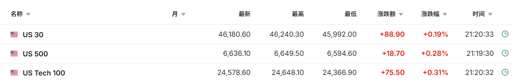 11月19日讯(编辑 赵昊)周三(11月19日)美股盘前,三大指数期货小幅走高。截至发稿,道琼斯指数期货涨0.19%,标普500指数期货涨0.28%,纳斯达克100指数期货涨0.31%。