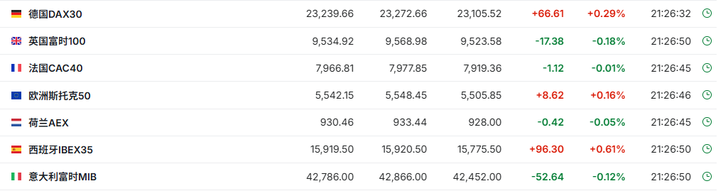 正在交易的欧洲股市涨跌不一,德国DAX指数现涨0.29%,英国富时100指数跌0.18%,法国CAC40指数跌0.01%。