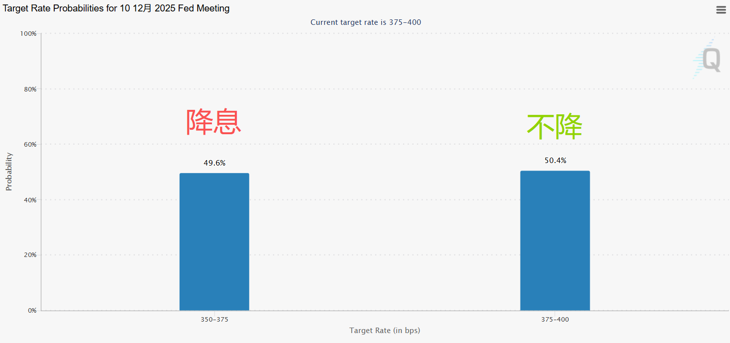 美股市场方面,随着一连串美联储官员对是否需要连续三次降息表达怀疑,“美联储”观察反映的掉期市场定价已经将12月9-10日降息的概率调整至“五五开”,而一个月前,12月降息的预测概率还是95%。周五也有三位美联储官员将发表讲话,其中包括今年有投票权的施密德。