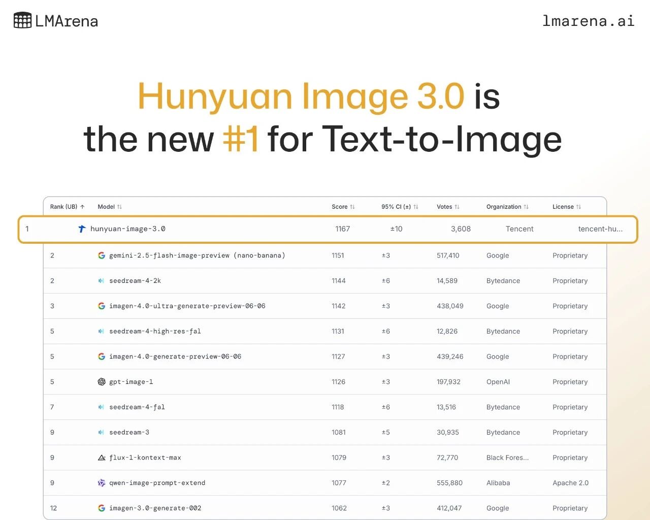 《科创板日报》10月5日讯(编辑 宋子乔) 国庆假期过半,大厂们的AI争霸赛并未因假期停歇。今日,腾讯宣布,其发布仅一周的混元图像3.0,在文生图领域的“权威竞技场”LMArena中,从全球26个大模型里突围,登顶第一,成为目前效果最好的开源生图模型,效果可对标业界头部闭源模型。腾讯混元团队透露,混元图像3.0目前的版本仅开放了文生图能力,图生图、图像编辑、多轮交互等版本将于后续发布。