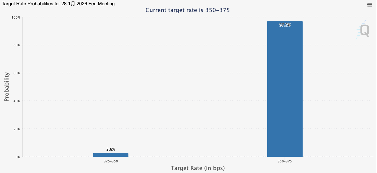 这份数据对本月底的美联储议息几乎没有影响——市场原本就不指望1月会降息。数据公布后,1月降息的概率从10%出头降至几乎为0,3月降息概率跌至3成,4月降息概率也跌破50%。