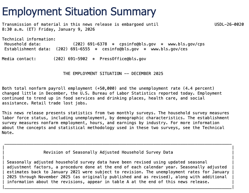 受到去年底美国政府创纪录停摆的影响,非农报告直到今天才恢复正常发布状态。最新报告也调整了前两个月的就业人数,其中11月从增加6.4万人下修至5.6万人,10月从减少10.5万人下修至减少17.3万人,两个月合计下修7.6万人。